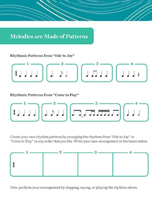 Halimbawa ng rhythmic pattern. Ang rhythmic pattern o ritmikong pattern ay ang pag-uulit ng malakas at mahina na mga elemento sa isang pagkakasunud-sunod ng mga tunog o paggalaw. 18 Ang rhythmic pattern ay ang pinagsama-samang mga note at rest na binuo ayon sa nakasaad na time signature.