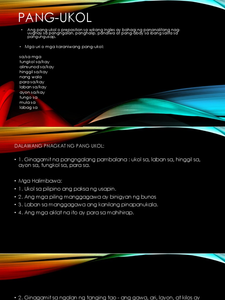 Dapat kumayod tayo para sa ating kinabukasan dahil kung. Pantukoy salitang laging nangunguna sa pangngalan o panghalip halimbawa si ang ang mga Below is a list of Filipino pang-ukol. Kapag ang unang salita naman ay nagtatapos sa titik N tinatanggal o kinakaltas ang N at pinapalitamn ng -ng.