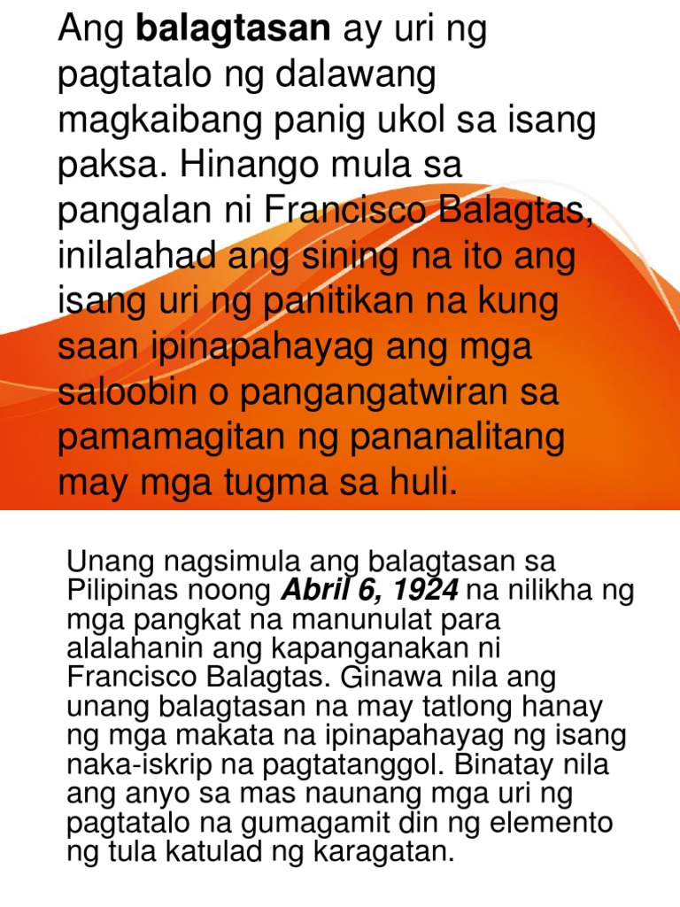 Ito ay maaaring tumagal hanggang sampung minute. ANO ANG BALAGTASAN Ang Balagtasan ay isang uri ng himagsikan kung saan ang mga salita mo ang ginagamit sa labanan. Abril 6 1924.