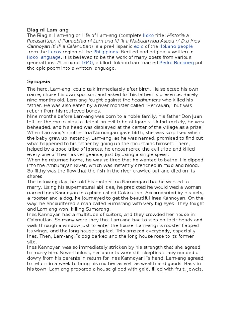 It was crucial process by which many traditions needed to be followed in order to have a promising birth. BIAG NI LAM-ANG Life of Lam-ang is pre-Hispanic epic poem of the Ilocano people of the Philippines. Biag ni lam-ang plot summary Along the way they met a group of young men who told him that they were on their way to Tarambang Burok to win the hand of Abyang Durunuun sister of Sumpoy the lord of the underworld and whose beauty was legendary.